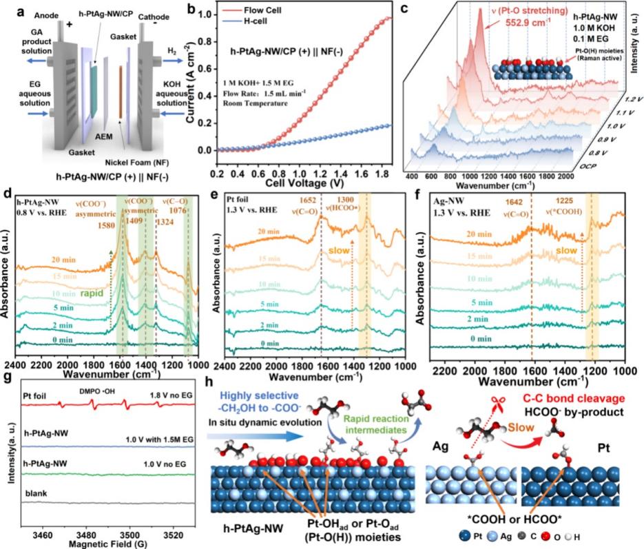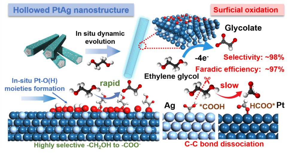 此工作通过原位动态电化学策略成功构筑空心PtAg纳米结构,在乙二醇电催化氧化制备乙醇酸中展现出卓越性能(选择性>99%,法拉第效率>97%),并且在AEM流动电解池中实现工业级电流密度(1.0 A cm⁻²),在低槽压下保持乙醇酸选择性>98%。利用原位拉曼/红外光谱与DFT计算,揭示了表面Pt-OHads和Pt-Oads活性位点的关键作用,通过优化中间体(如*OCCH₂OH)吸附自由能,显著加速C-OH键氧化动力学,同时抑制C-C键断裂副反应。表面适度氧化态诱导的电子结构调控,使得乙醇酸生成路径的能垒降低。该工作为电催化氧化有机醇类的高效铂基催化剂的设计提供了新思路,并验证了原位动态结构演化与表面化学调控协同提升电催化性能的可行性,为生物降解塑料(如聚乙醇酸)单体绿色合成提供了可靠路径。