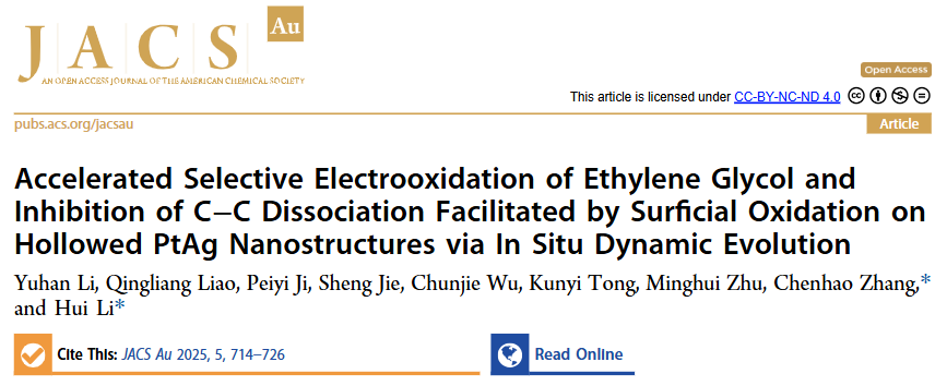 九秀直播 李辉教授/张宸豪副教授团队在JACS Au上发表题为“Accelerated Selective Electrooxidation of Ethylene Glycol and Inhibition of C-C Dissociation Facilitated by Surficial Oxidation on Hollowed PtAg Nanostructures via In Situ Dynamic Evolution”的研究论文。通过原位动态电化学策略成功构筑空心PtAg双金属纳米结构,在碱性介质中实现乙二醇高效定向氧化为乙醇酸。九秀直播 为文章唯一通讯单位,2024级博士李毓涵为论文第一作者,李辉教授、张宸豪副教授为论文通讯作者。