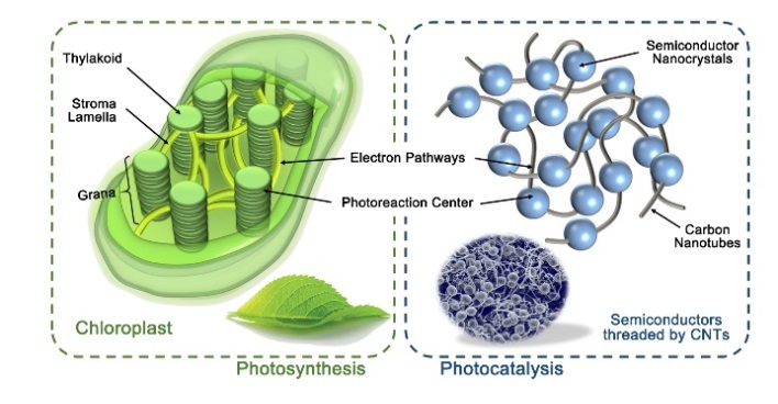 团队受光合作用启发,如图所示,叶绿体基粒吸收太阳能产生电子,基质片层作为传输通道转移电子,二者形成的非连续串联结构实现了二氧化碳到有机物的转化。