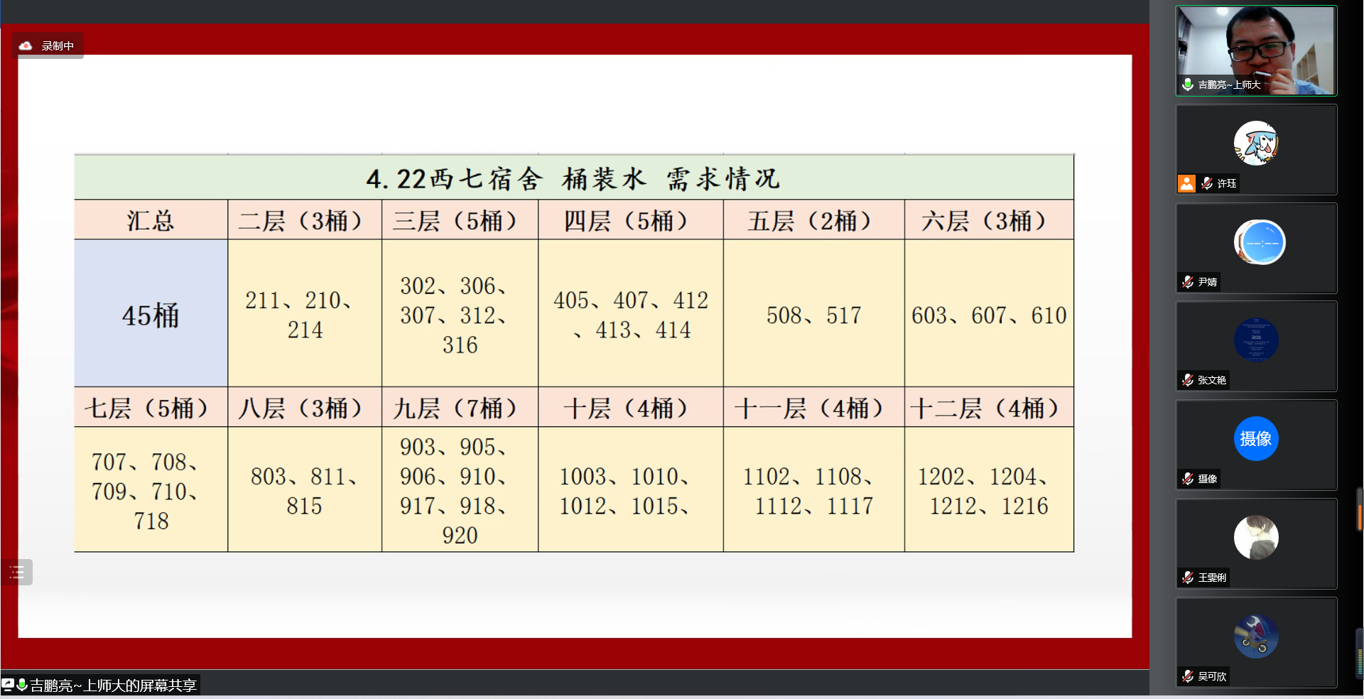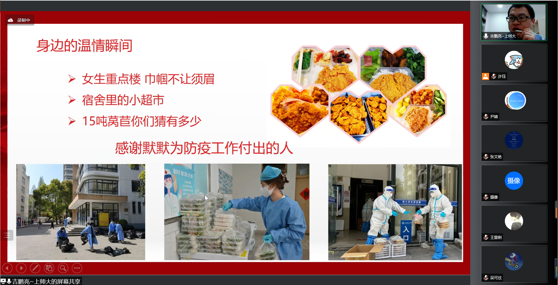3. 研究生辅导员吉鹏亮老师向我们分享了他目前在徐汇校区疫情防控的情况。通过吉老师讲述他在西七宿舍楼工作时的压力和趣事,我深刻感受到疫情当下,老师、志愿者以及后勤工作人员的辛劳,是他们的默默付出和无私奉献,才保障了同学们的日常生活。每一个人的付出,都值得被我们尊敬!