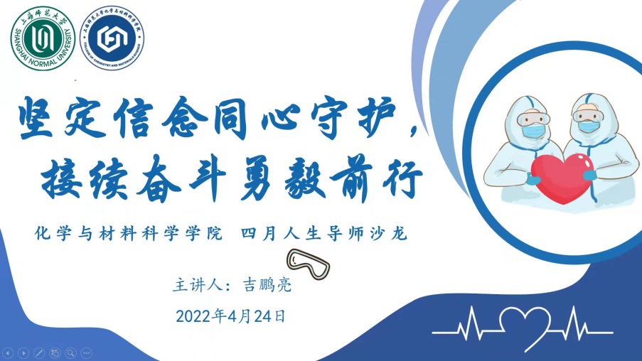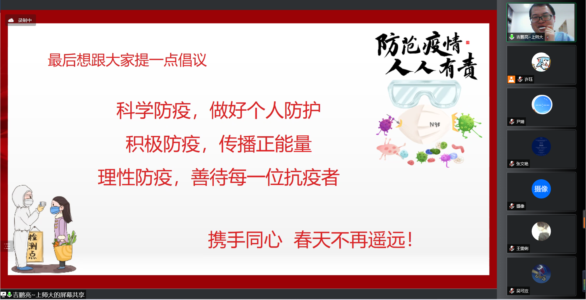 首先,吉鹏亮老师分享了自己入校40多天的战“疫”经历。上海疫情升级后,九秀直播 所有辅导员老师第一时间离开了自己的家庭,投身徐汇、奉贤两校区的战“疫”一线,辗转在各个需要他们的地方,从寒冷的冬天奋战到绿意萦怀的盛春。吉老师为同学们分析了当日的疫情新增数据,从数据可以看出,目前疫情态势正在稳中向好,吉老师鼓励同学们要坚定信心、坚持不懈。