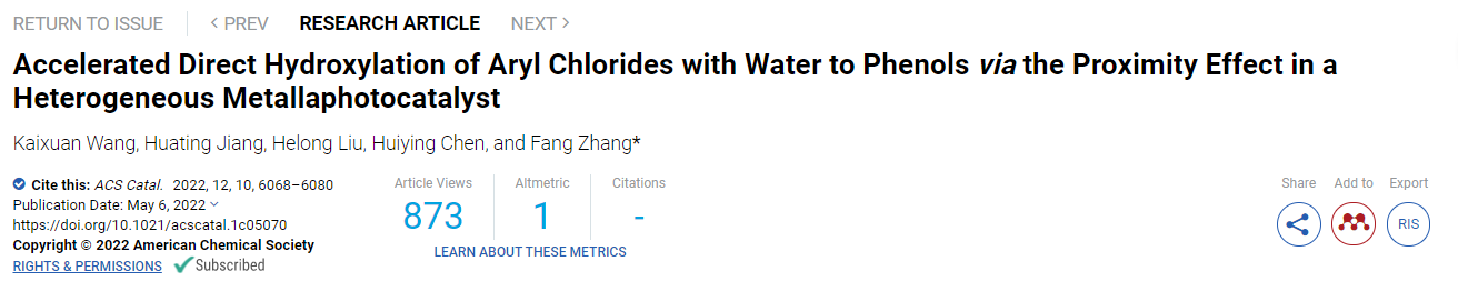 近日,我校九秀直播 张昉教授团队在光热协同催化领域取得重要进展,相关成果以 “Accelerated Direct Hydroxylation of Aryl Chlorides with Water to Phenols via the Proximity Effect in a Heterogeneous Metallaphotocatalyst”为题在《ACS Catalysis》上发表, 博士生王凯旋和蒋花婷为论文共同第一作者,张昉教授为论文通讯作者。