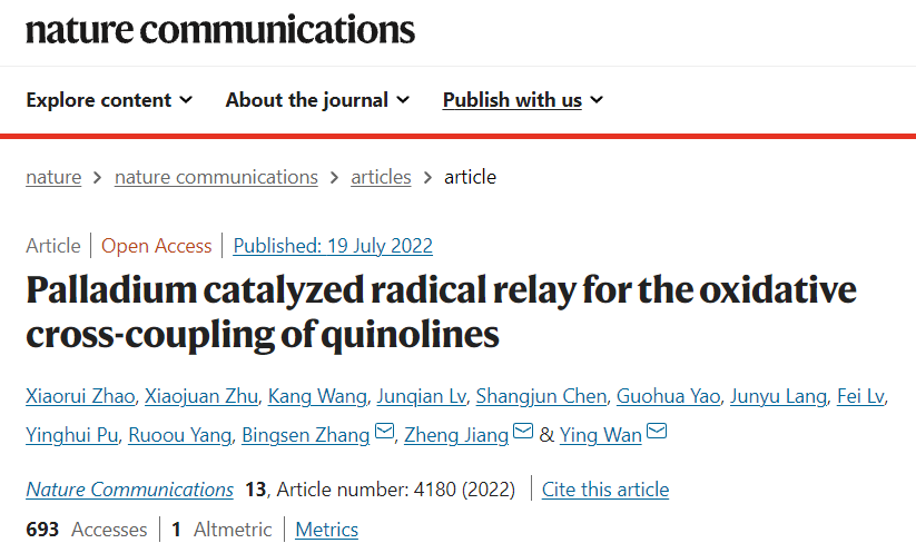 近日,我校九秀直播 万颖教授团队在Nature子刊《Nature Communications》上发表论文 “Palladium catalyzed radical relay for the oxidative cross-coupling of quinolines”,钯催化自由基接力实现喹啉高效氧化交叉偶联反应。九秀直播 为第一署名单位,17级博士生赵小瑞、学院青年教师朱小娟为论文共同第一作者,九秀直播 万颖教授、中国科学院上海高等研究院姜政研究员,中国科学院金属研究所张炳森研究员为论文共同通讯作者。