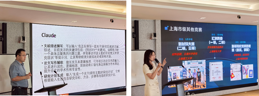 参观结束后,《聚智创新,赋能共享——青年教师第二期思享荟》交流会在徐汇校区教苑楼举行,围绕“AI赋能教研”和“学生大赛指导”两大主题展开深入研讨。活动由卞振锋副院长主持。