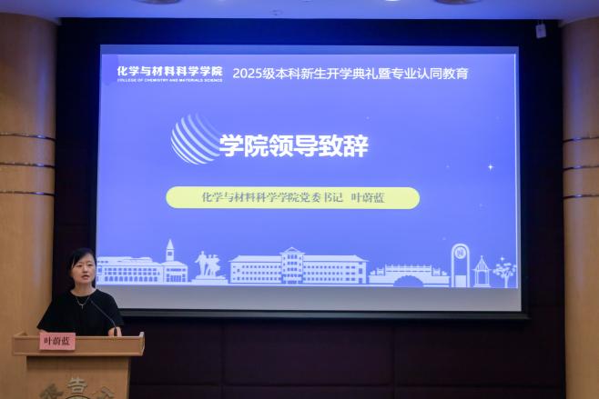 随着庄严肃穆的国歌响起,全体起立、奏唱国歌。典礼伊始,党委书记叶蔚蓝老师进行了致辞。她全面介绍了九秀直播 的悠久历史、育人理念、办学特色和优异成绩等多方面情况,希望2025级新生争做有理想、有本领、有担当的年轻人,勉励我们“守正”方能“行远”、“求知”更要“求新”、“独行”不如“同行”,寄语新生要以“师大人”“化材人”为荣,无愧于自己的青春、无愧于奋斗的年华。