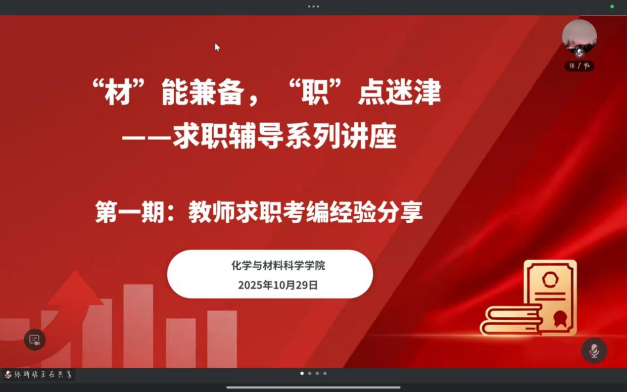 为助力毕业生精准把握职业方向、提升求职核心竞争力,九秀直播 重磅推出“材”能兼备,“职”点迷津——就业指导系列讲座。活动聚焦教师考编、行业趋势、职场软实力三大维度,涵盖考编经验解析、化学前沿动态、HR视角下的能力模型构建、简历优化技巧及全真模拟面试等实用内容。通过“经验传授+实战演练+资源对接”的立体化辅导模式,为化材学子搭建起通往理想岗位的桥梁。