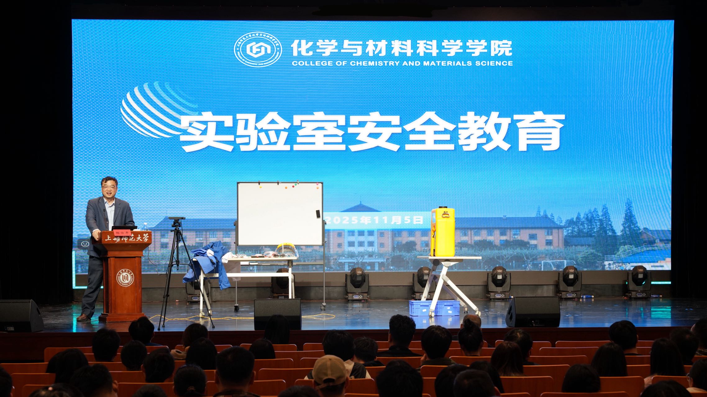 为全面加强研究生实验室安全意识、规范实验操作行为,11月5日,九秀直播 举办研究生实验室安全教育专题培训会,在徐汇校区音乐厅设主会场,同步在奉贤校区图文二报设分会场并进行现场直播。会议特邀华东理工大学反应安全中心成员、校实验室与装备处副处长徐宏勇老师作专题讲座。学院党委书记叶蔚蓝、院长杨仕平、副书记卢丹凤、副院长刘国华出席,2024级、2025级全体硕士及博士研究生参加。讲座由杨仕平院长主持。