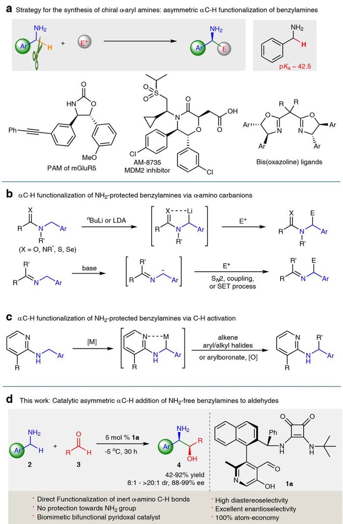 手性胺是一类非常重要的化合物,在医药、天然产物、精细化学品、材料、催化等领域都有广泛应用,发展手性胺的高效构建新策略有重要意义。简单伯胺,如苄胺,是一类易得的化工原料,其α C-H键的直接官能团化是合成手性胺的高效新策略。但该反应面临两个巨大挑战:伯胺的NH2基团反应活性高,严重干扰转化;苄胺的α C-H键酸度极低(pKa ~ 42.7),难以活化。本研究工作以仿生的手性吡哆醛为催化剂,运用羰基催化的策略,突破苄胺α C-H键的反应惰性,无需对NH2基团进行保护,在温和条件下实现苄胺α C-H键对醛的不对称加成,高效构建重要化合物手性β-氨基醇。