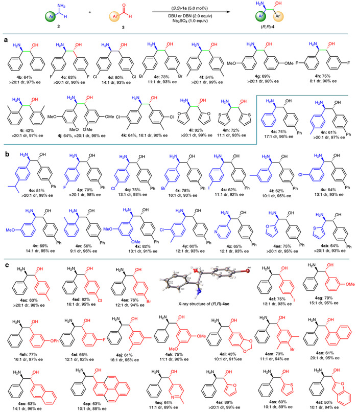 羰基催化能促进伯胺α C-H键的直接不对称转化,是一种受生物过程启发的新型催化模式,已被成功地应用于甘氨酸酯的不对称仿生Mannich反应、仿生Aldol反应、α-C Michael加成反应和α-C烯丙基化等反应。然而,到目前为止,该策略主要局限于含有强吸电子基团的活化伯胺,例如α-氨基酸酯(pKa~24)、(2-吡啶基)甲胺等。为了实现惰性伯胺化合物苄胺的α C-H键的转化,作者发展了一系列含有方酸侧链的手性吡哆醛催化剂,并应用于苄胺α C-H键对芳基醛的不对称加成反应。在筛选出最佳的催化剂以及反应条件后,对反应的底物进行了考察,各种芳基甲胺和芳基醛都能很好地适用于该转化,以较好的收率和优秀的非对映选择性、对映选择性得到一系列的手性β-氨基醇化合物。