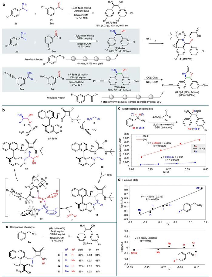 机理研究表明该反应经历了羰基催化的反应历程,其中苄胺α C-H键的去质子化是反应的决速步,方酸侧链上的苯基以及叔丁基对于反应的立体选择性控制起着重要作用。苄胺α C-H键的活化是通过与吡哆醛催化剂形成亚胺实现的,计算化学研究表明该 C-H键的pKa值由42.7提高到24.4,酸性提高了10的18次方倍,展示了仿生吡哆醛催化剂的强大活化能力。该研究工作不仅提供了重要化合物β-氨基醇的高效构建新方法,进一步发展了羰基催化化学,还拓展了维生素B6核心骨架在仿生不对称催化中的应用。