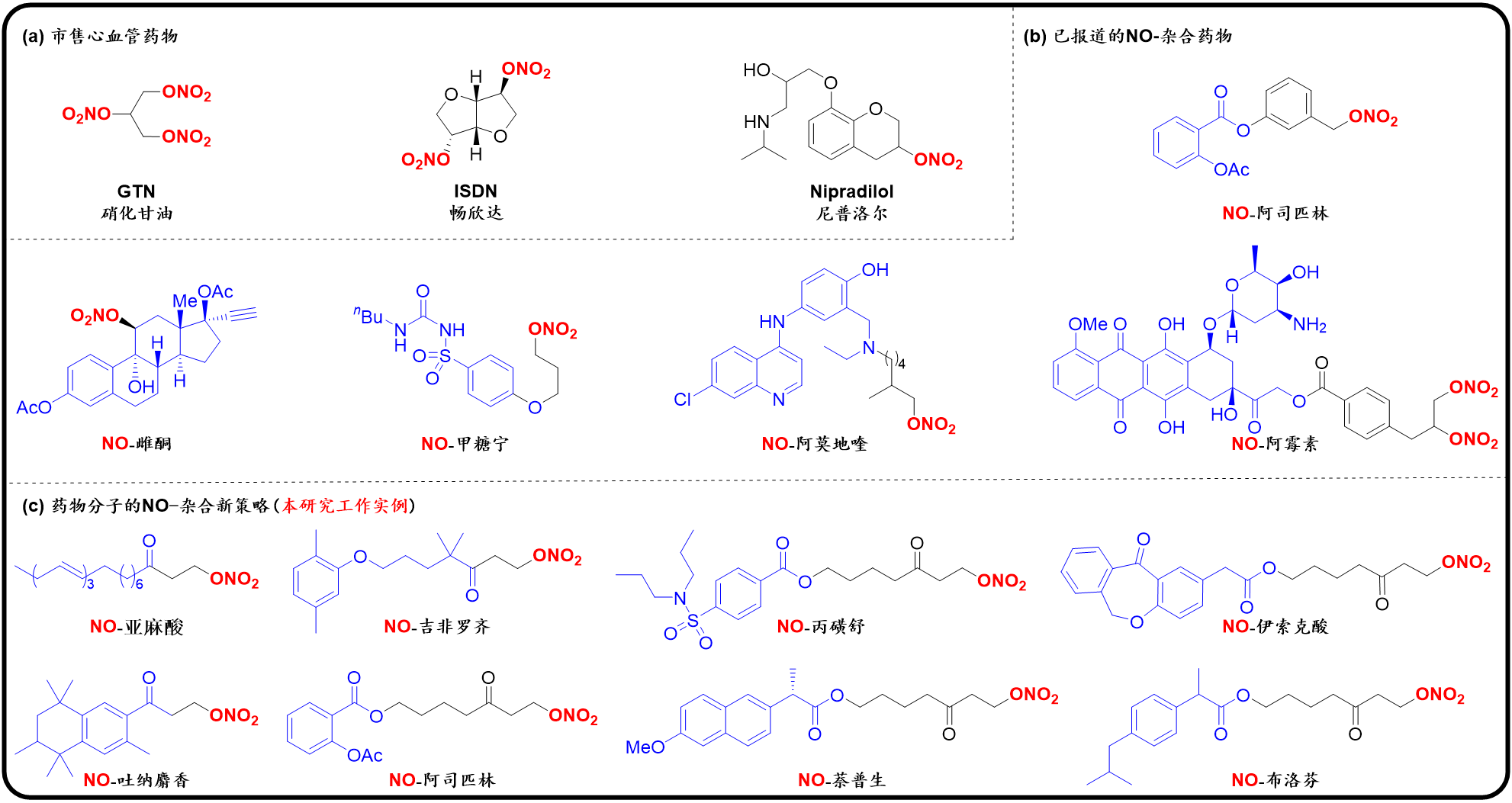 硝酸酯类化合物,不仅可以作为一氧化氮的供体常用于心血管药物(如图a所示),还可以用于改善已有药物的疗效(增强药效、降低毒副作用,如图b所示),在医药、含能材料、有机合成砌块等领域中有着广泛的应用。目前虽然已有一些硝酸酯化反应被开发出来,但仍有很多局限和不足,主要包括:1)无法规避混酸体系或者当量金属试剂的使用;2)反应选择性差、底物范围窄;3)底物需要预活化。基于绿色和可持续化学的发展理念,开发新型硝酸酯化试剂以实现高效的硝酸酯化反应是亟待解决且富有挑战性的课题。