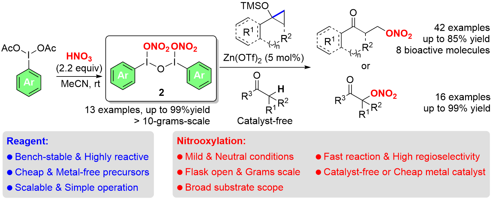 邓清海教授课题组基于组内先前的研究经验(Org. Chem. Front., 2016, 3, 934; Org. Lett.2019, 21, 7315; Org. Chem. Front.2020, 7, 3509),从廉价的二乙酸碘苯或芳基碘出发,以硝酸为原料,成功设计并合成了一类结构稳定、活性可调的硝酸酯化试剂,开发了一系列安全、高效、绿色、快捷的硝酸酯化反应。同时,利用该策略还成功地将硝酸酯基团引入到天然产物或药物分子中(如图c所示)。该类试剂在有机合成及药物合成上有着广阔的应用前景。