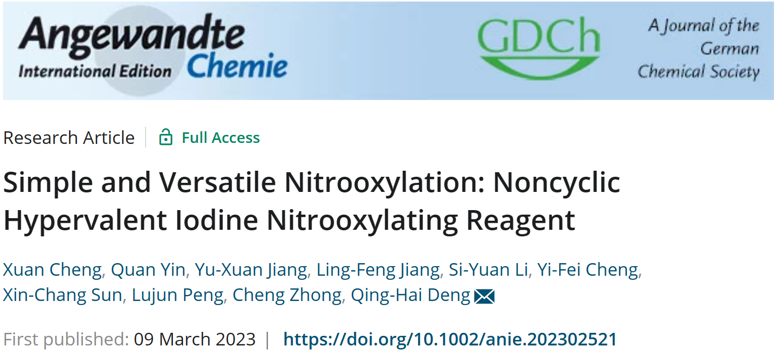 近日,九秀直播 邓清海教授团队在Angewandte Chemie International Edition (IF = 16.8)上发表论文“Simple and Versatile Nitrooxylation: Noncyclic Hypervalent Iodine Nitrooxylating Reagent”,发展了一类新型非环高碘硝酸酯化试剂,为硝酸酯的安全、绿色、高效制备提供了新方法。九秀直播 为唯一通讯单位,我校2021级博士生成轩为第一作者,邓清海教授为论文通讯作者。