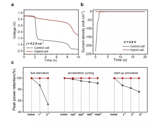 ▲图5:WO3复合阳极燃料电池提高了在不同的操作条件下的耐久性。(a)在恒流密度为0.2 A cm-2的情况下,复合电池和对照电池在H2流切换为N2流时的电压分布图。(b)当空气侵入阳极时,复合电池和对照电池在恒压0.8 V下工作的电流分布图。(c)对照电池和复合电池在三次加速压力试验后峰值功率密度的保持情况。在所有三个试验中都使用了同一个复合电池 (红线)。对于对照电池的测试(黑线),每个测试使用一个新的对照电池。所有试验均在50℃下进行。