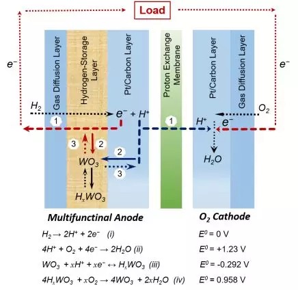 WO3在-0.4V至0.5V(vs. RHE)电位区间存在W+5/W+6氧化还原对,PEMFC阳极中的质子和电子可动态存储在WO3储能层中,当阳极出现质子或者氢气供应不足时,储能层可以放出质子和电子,缓解电池阳极极化。当电池恢复到正常燃料供应后,质子和电子又可以再次存储于WO3中。当有氧气或者空气入侵阳极,还原态的HxWO3也可与氧气反应,避免阳极电位升高。