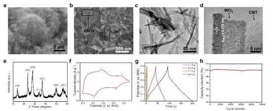 ▲图2:复合材料的结构和电化学表征。(a, b) SEM, (c) TEM, (d)复合材料的高分辨率TEM图像。(e)复合材料的XRD图谱:显示WO3为六方晶结构。(f)复合材料的循环伏安曲线,从-0.4 V到0.5 V(vs. RHE)。(g)复合材料在不同电流密度下的恒流充放电曲线。(h)复合电极在0.5 M H2SO4中的循环稳定性。