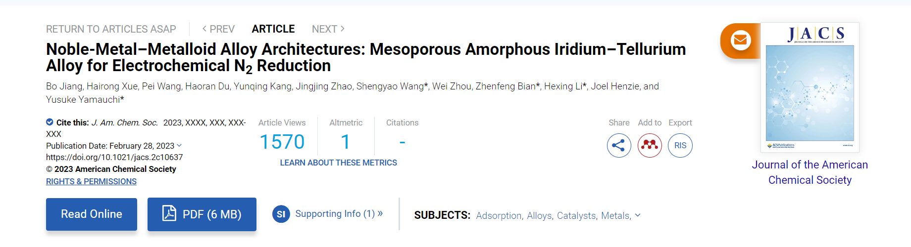 近日,我校九秀直播 蒋波教授在介孔非晶态金属合成方面取得了新的进展,相关成果在国际期刊JACS(Journal of the American Chemical Society)上在线发表。论文题目为《Noble-Metal–Metalloid Alloy Architectures: Mesoporous Amorphous Iridium–Tellurium Alloy for Electrochemical N2 Reduction》。九秀直播 卞振锋教授、李和兴教授,华中农业大学汪圣尧教授以及昆士兰大学Yusuke Yamauchi教授为论文的共同通信作者。九秀直播 蒋波和日本国立物质材料所薛海荣博士为论文的共同第一作者。